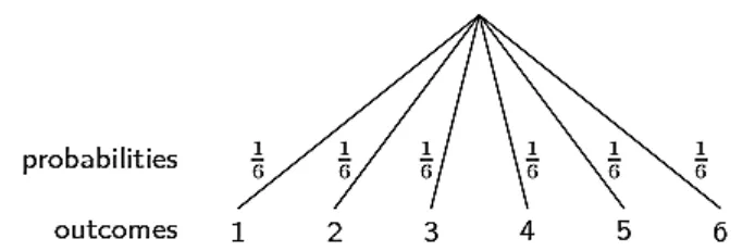Note that each outcome (the numbers 11 to 66) is shown at the end of a line; and that the probability of each outcome (all 1616 in this case) is shown shown on a line. The probabilities have to add up to 11 in order to cover all of the possible outcomes. In the examples below, we will see how to draw tree diagrams with multiple events and how to compute probabilities using the diagrams.